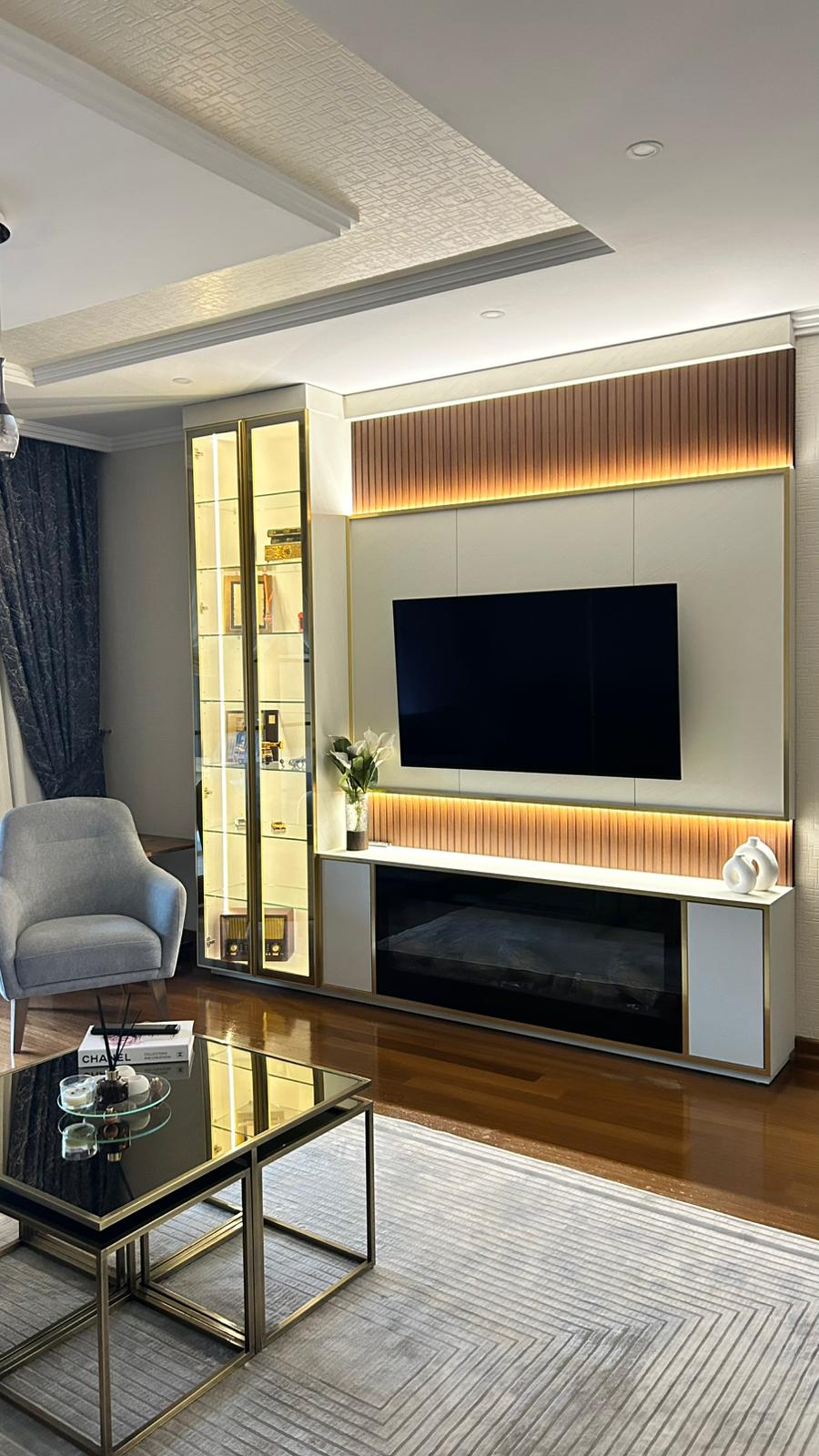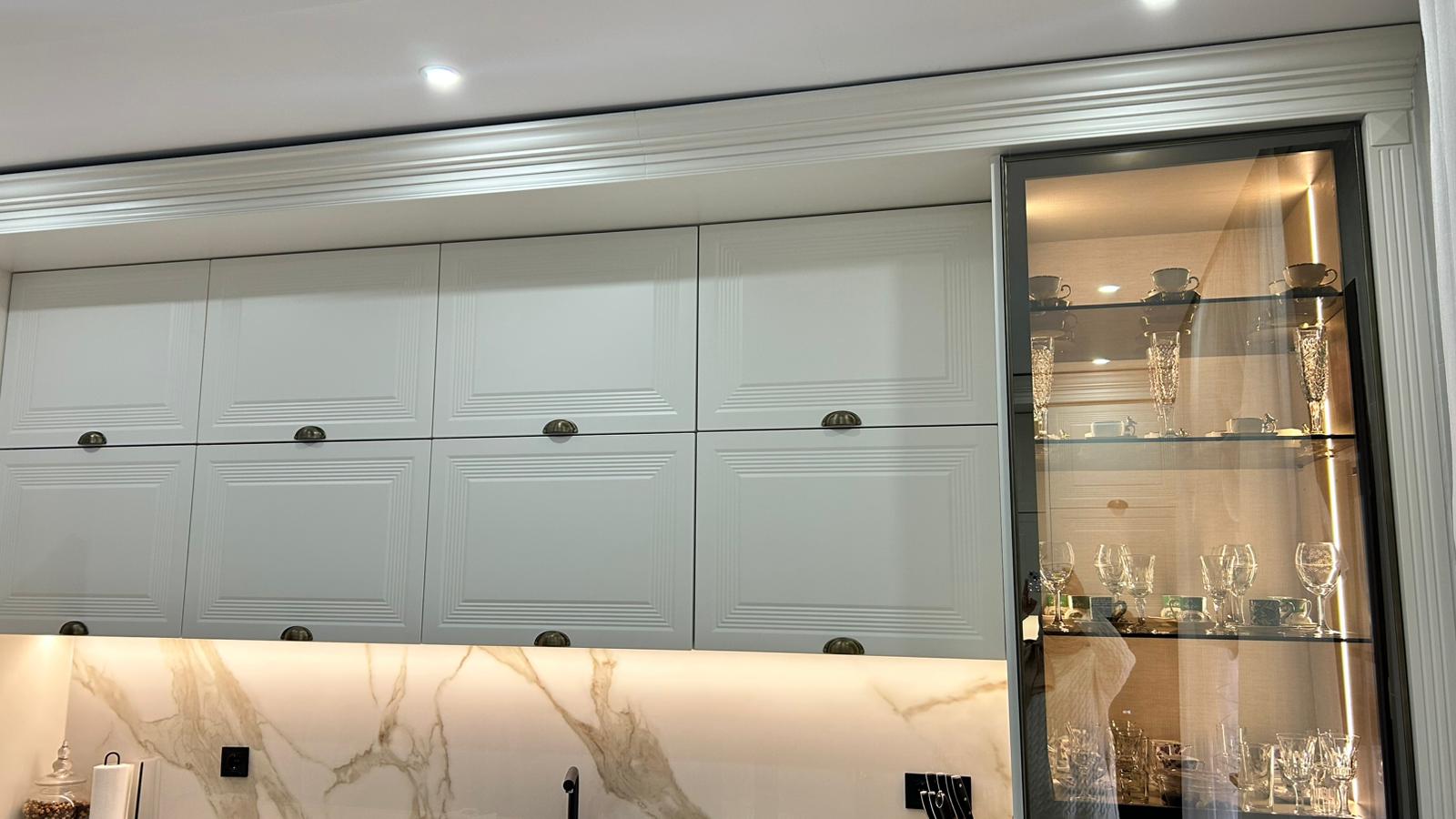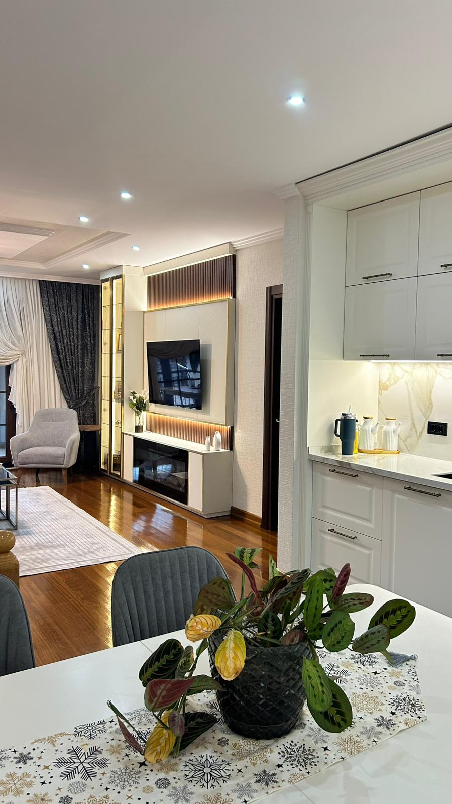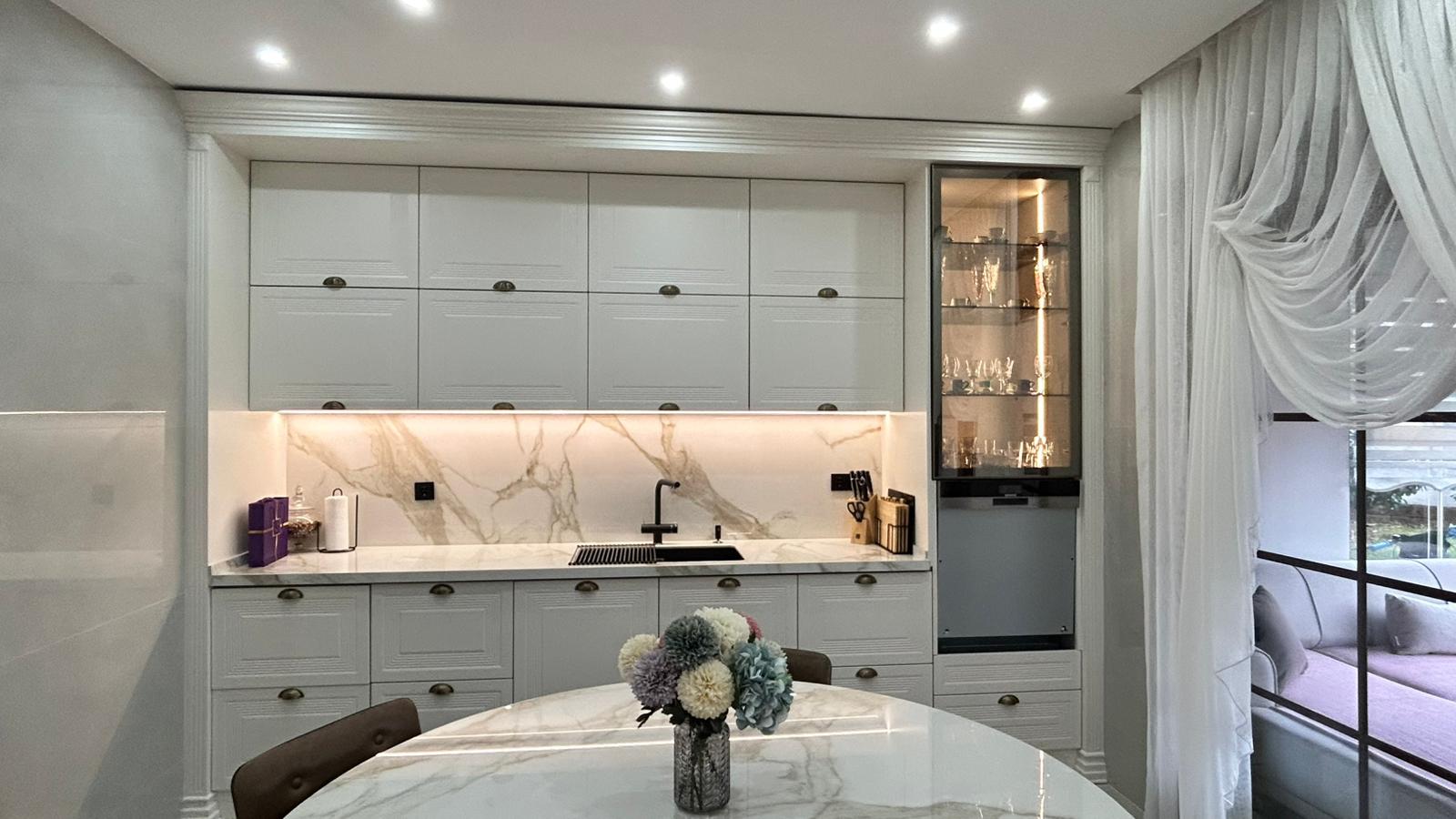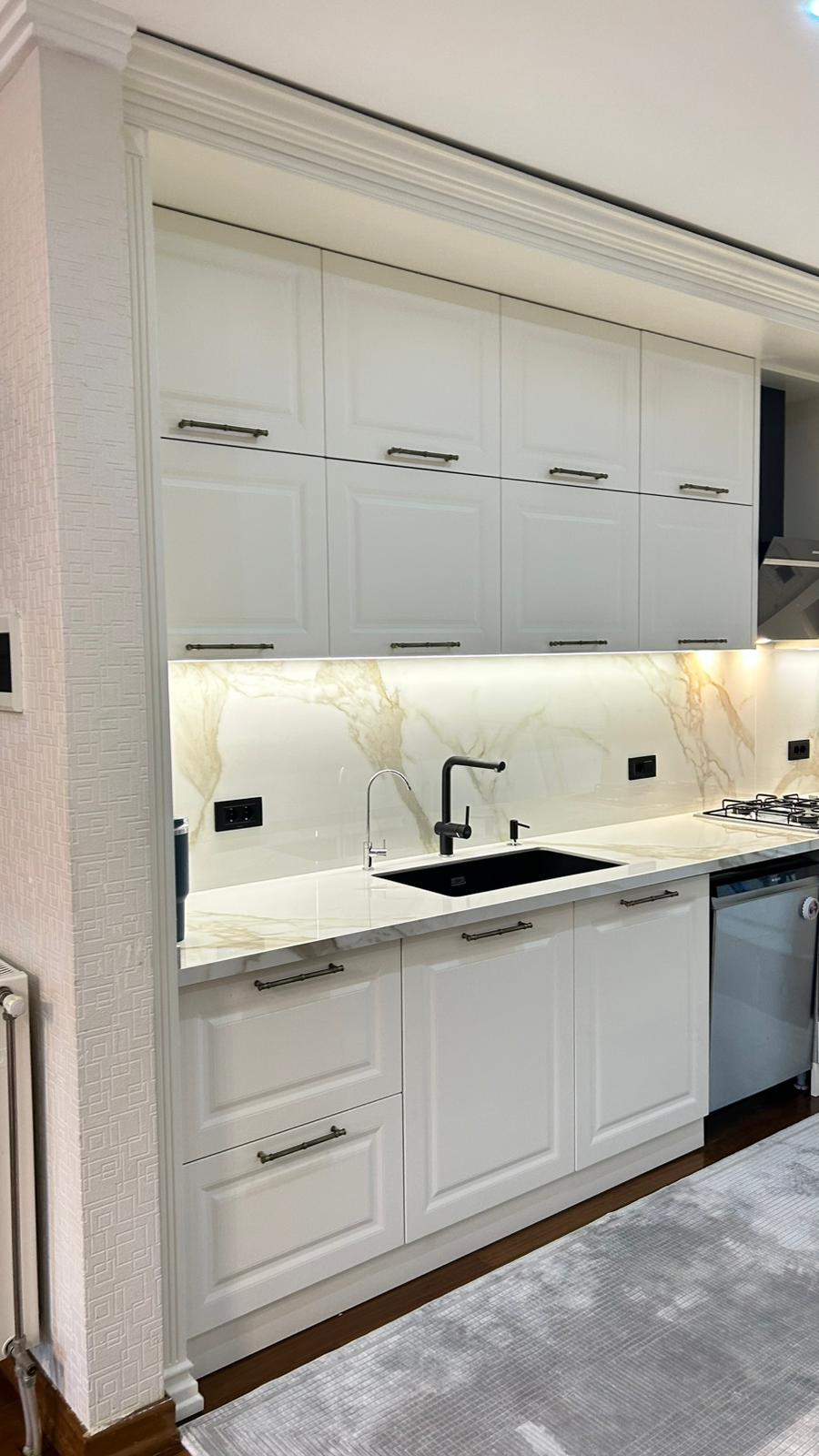 Bu projede 2 adet mutfak ve 1 adet TV ünitesi tasarım, üretim ve uygulaması tarafımızdan anahtar teslim olarak gerçekleştirilmiştir. Klasik ve modern çizgilerin harmanlandığı özel üretim mobilyalar, fonksiyonel çözümler ve dekoratif aydınlatma detaylarıyla mekâna estetik ve kullanışlı bir bütünlük kazandırılmıştır.