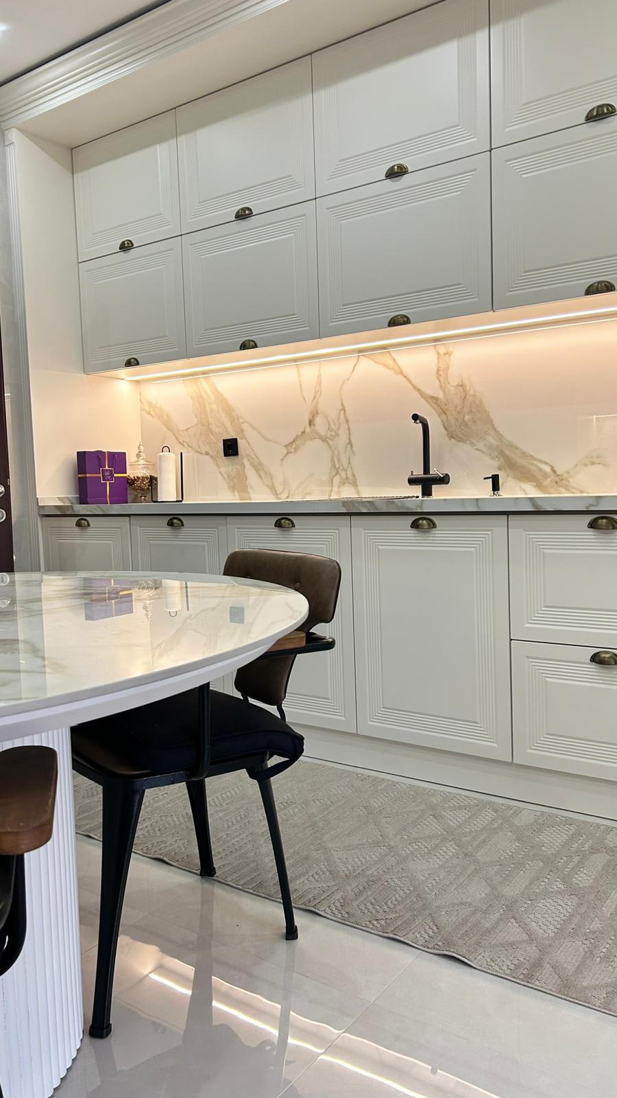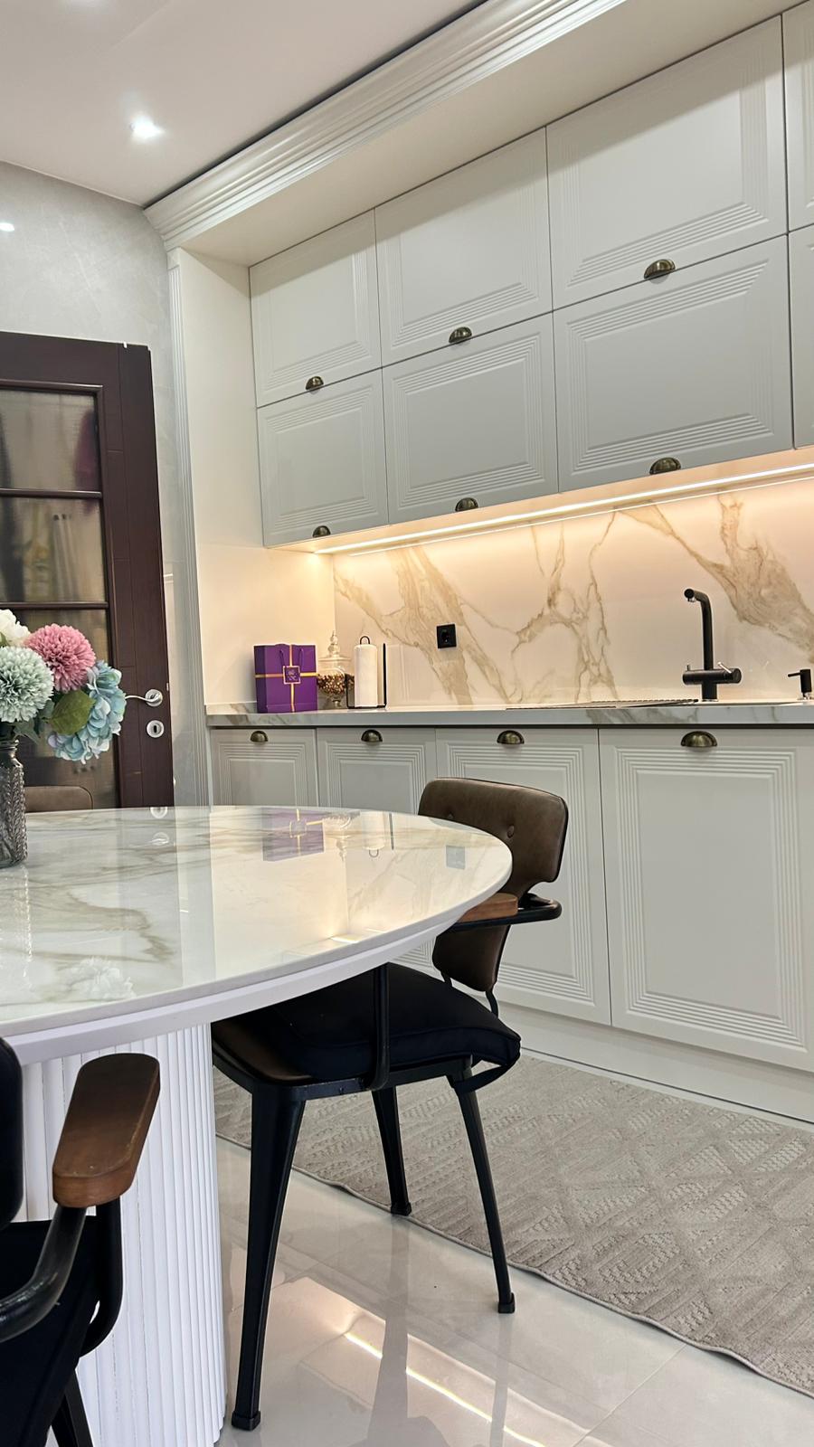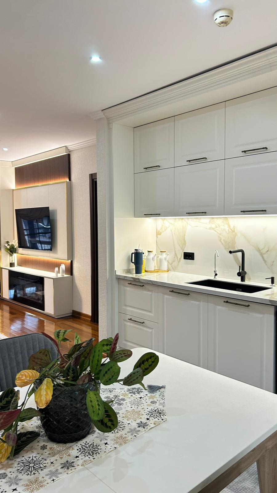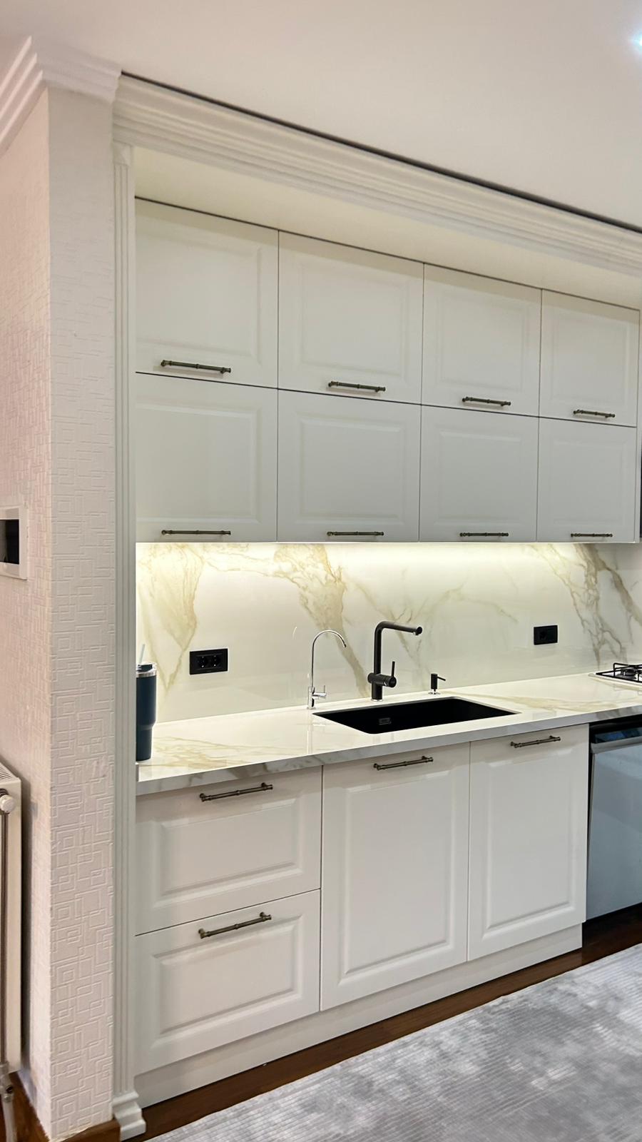 Bu projede 2 adet mutfak ve 1 adet TV ünitesi tasarım, üretim ve uygulaması tarafımızdan anahtar teslim olarak gerçekleştirilmiştir. Klasik ve modern çizgilerin harmanlandığı özel üretim mobilyalar, fonksiyonel çözümler ve dekoratif aydınlatma detaylarıyla mekâna estetik ve kullanışlı bir bütünlük kazandırılmıştır.