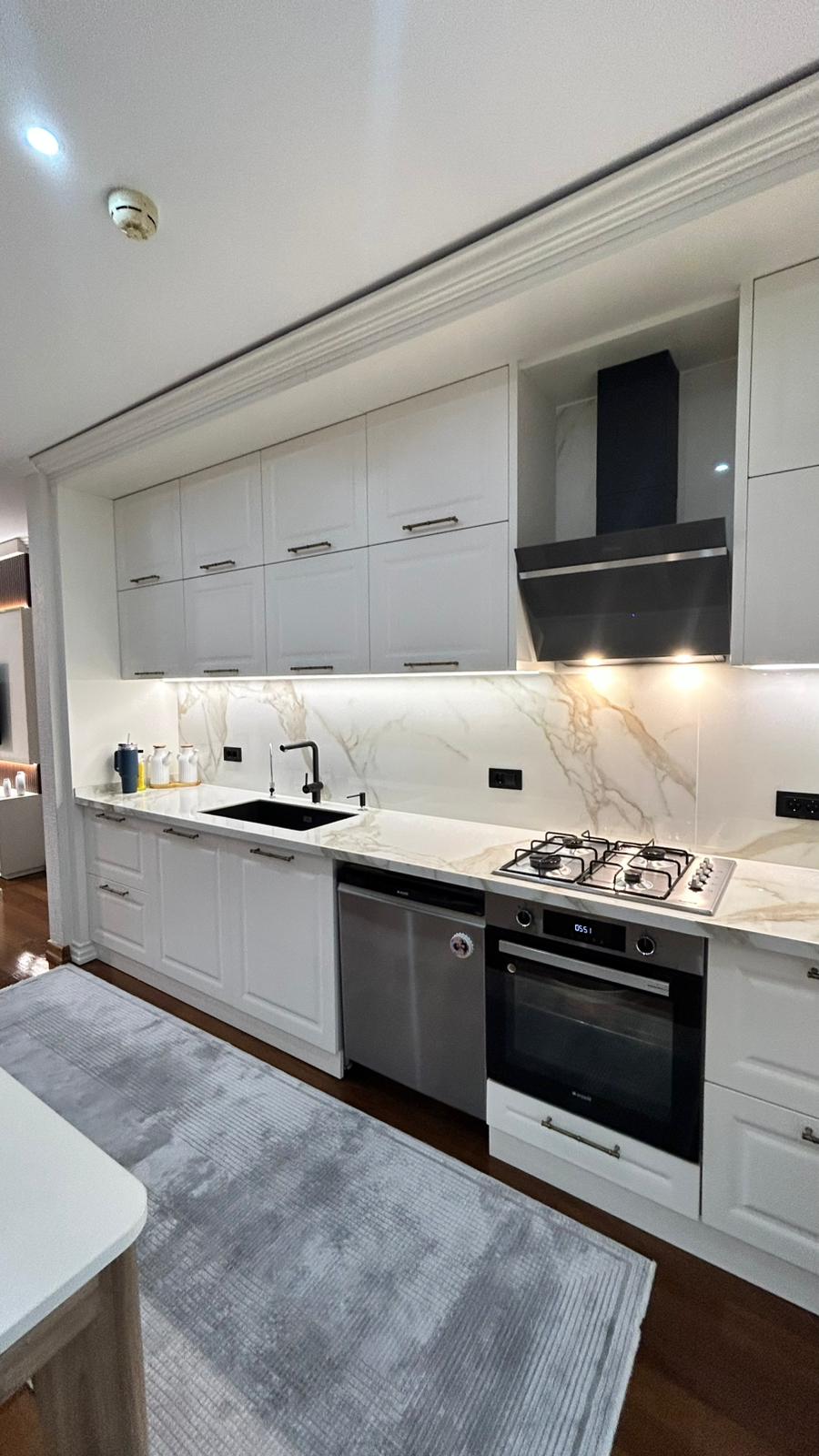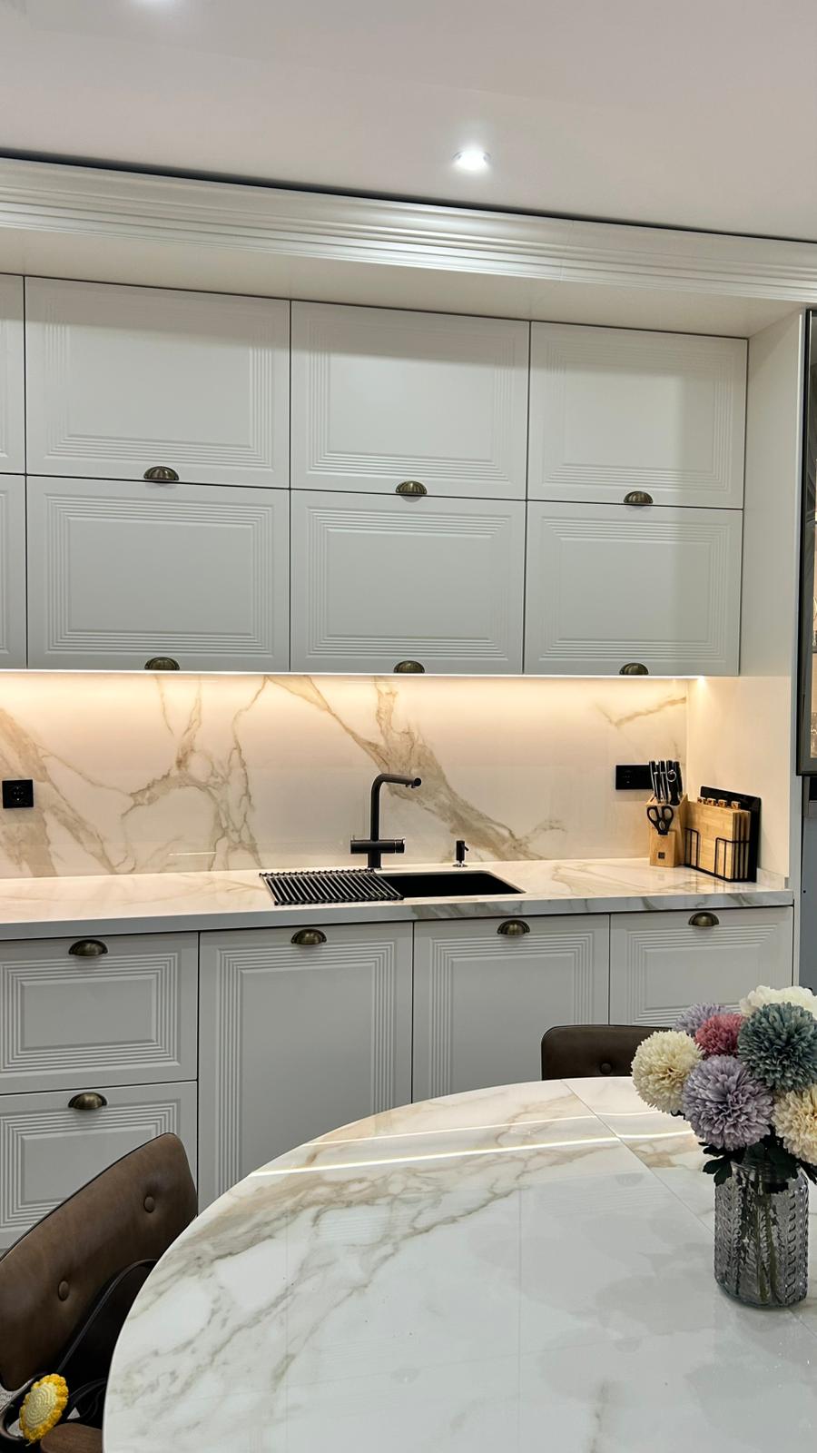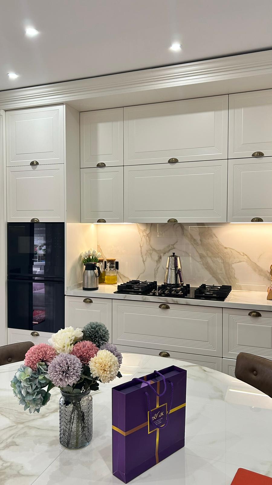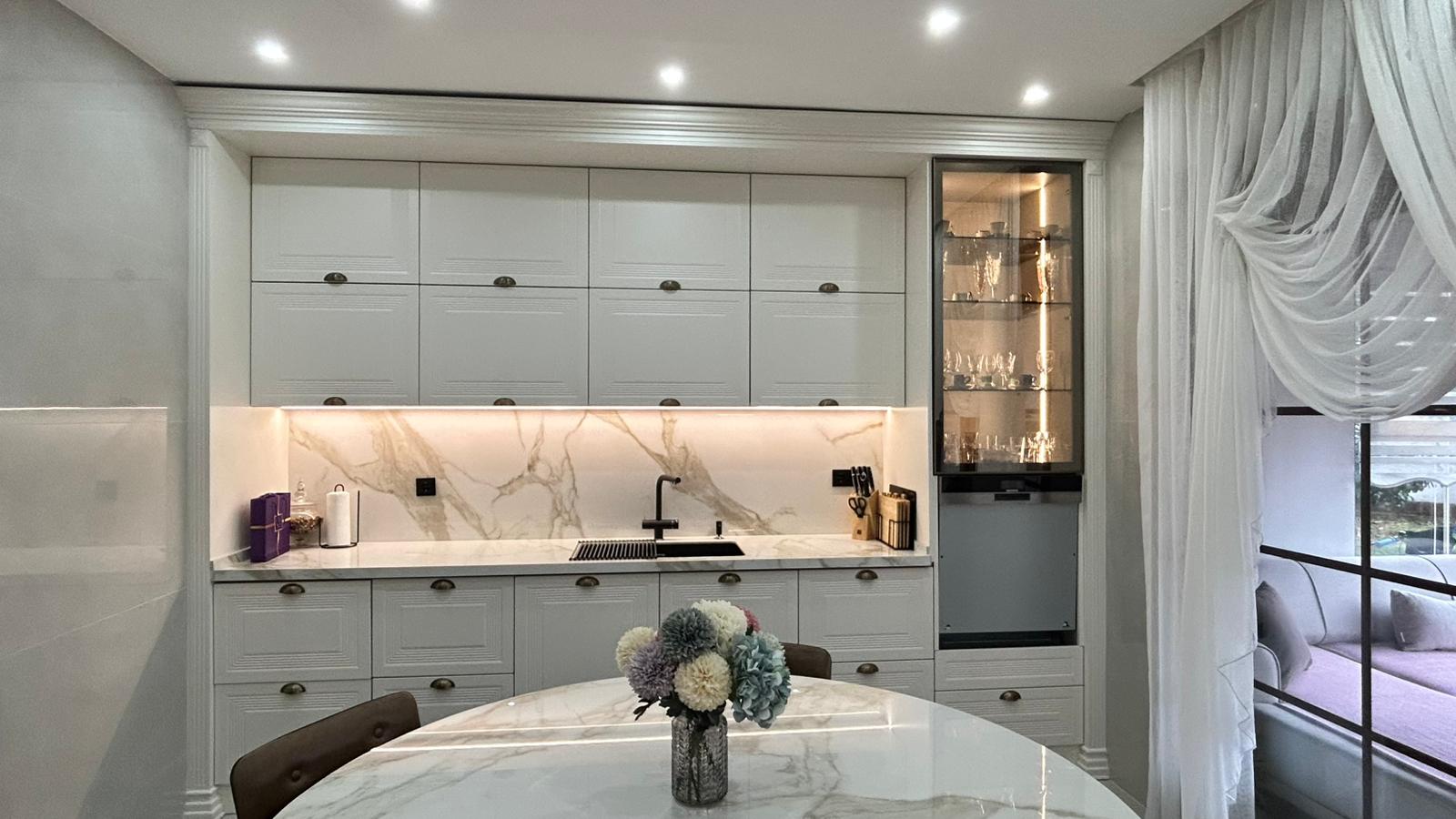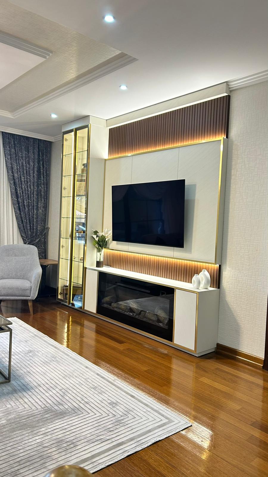 Bu projede 2 adet mutfak ve 1 adet TV ünitesi tasarım, üretim ve uygulaması tarafımızdan anahtar teslim olarak gerçekleştirilmiştir. Klasik ve modern çizgilerin harmanlandığı özel üretim mobilyalar, fonksiyonel çözümler ve dekoratif aydınlatma detaylarıyla mekâna estetik ve kullanışlı bir bütünlük kazandırılmıştır.