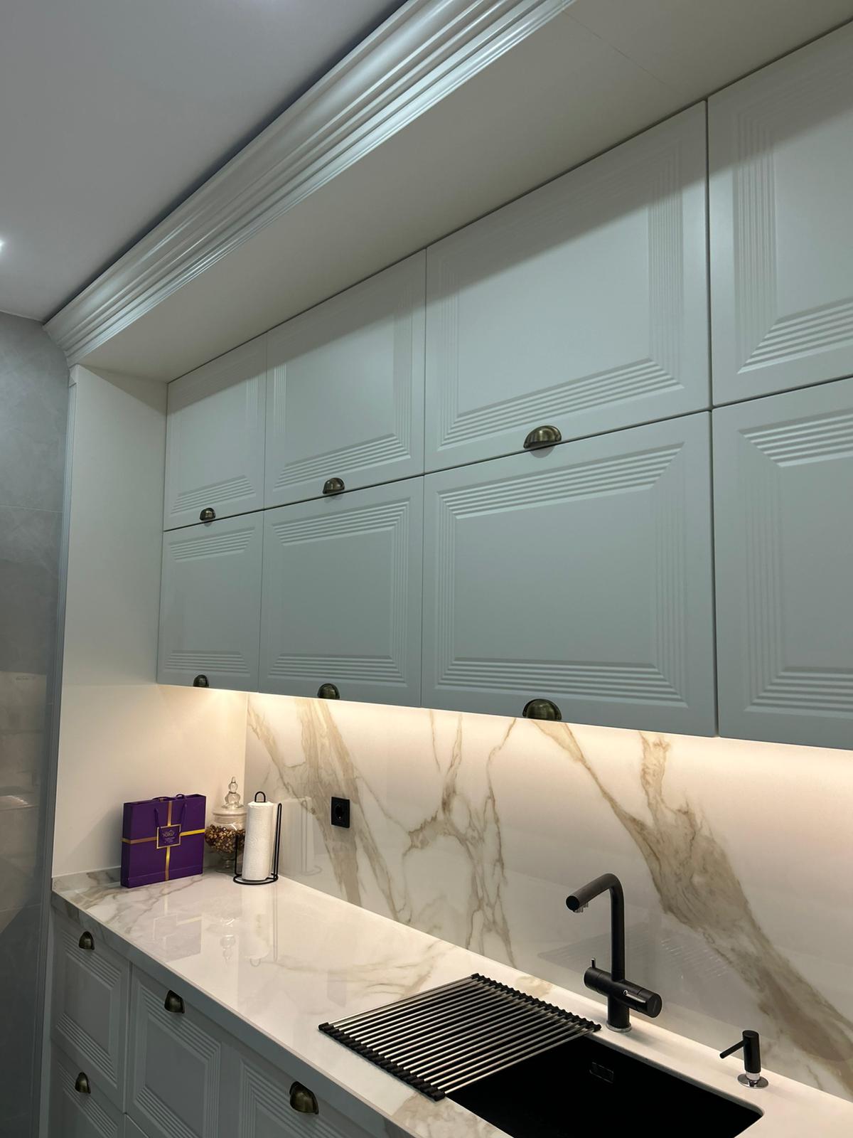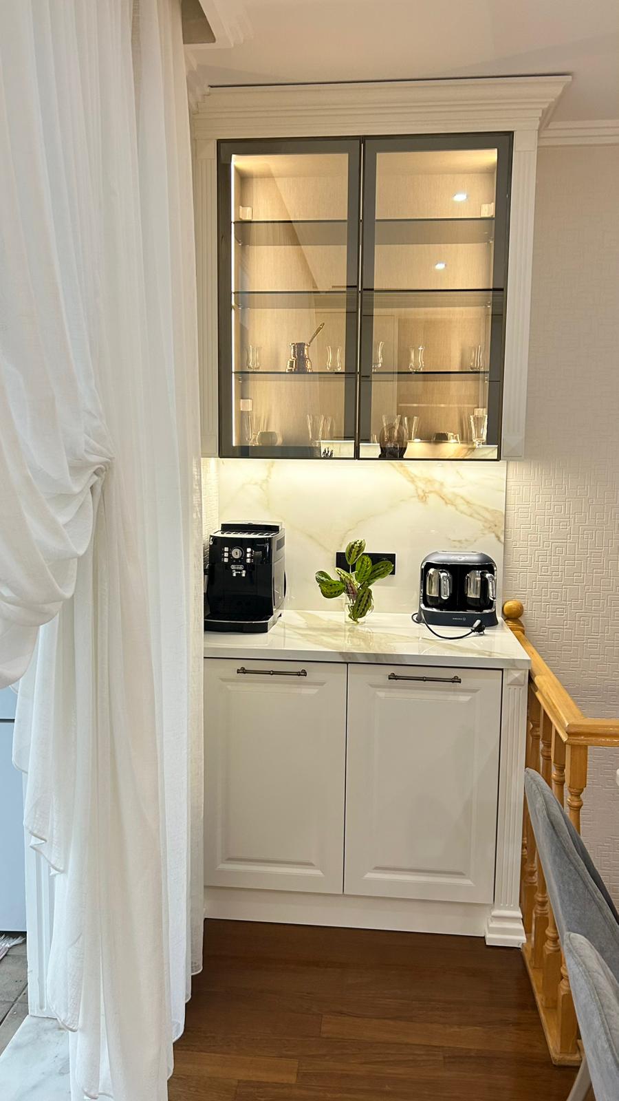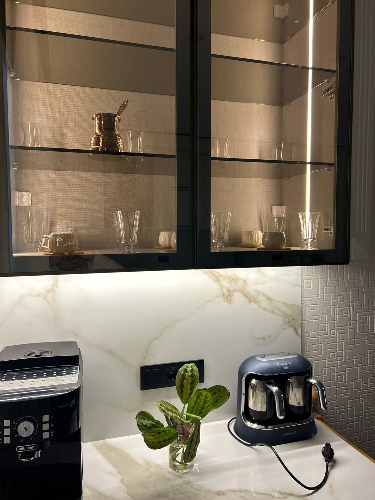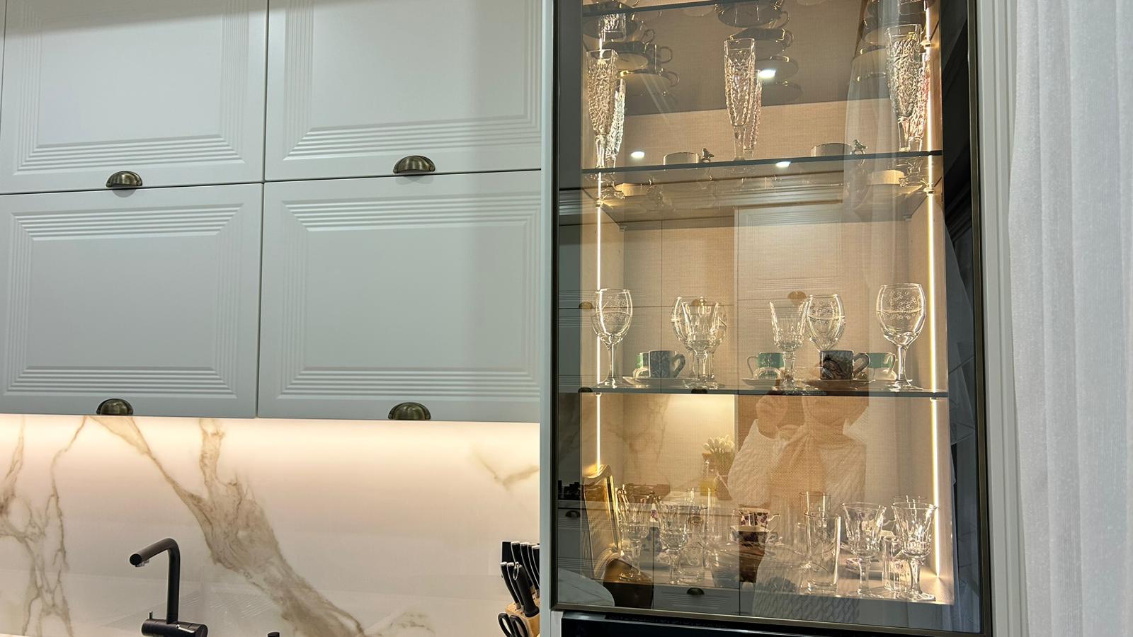 Bu projede 2 adet mutfak ve 1 adet TV ünitesi tasarım, üretim ve uygulaması tarafımızdan anahtar teslim olarak gerçekleştirilmiştir. Klasik ve modern çizgilerin harmanlandığı özel üretim mobilyalar, fonksiyonel çözümler ve dekoratif aydınlatma detaylarıyla mekâna estetik ve kullanışlı bir bütünlük kazandırılmıştır.