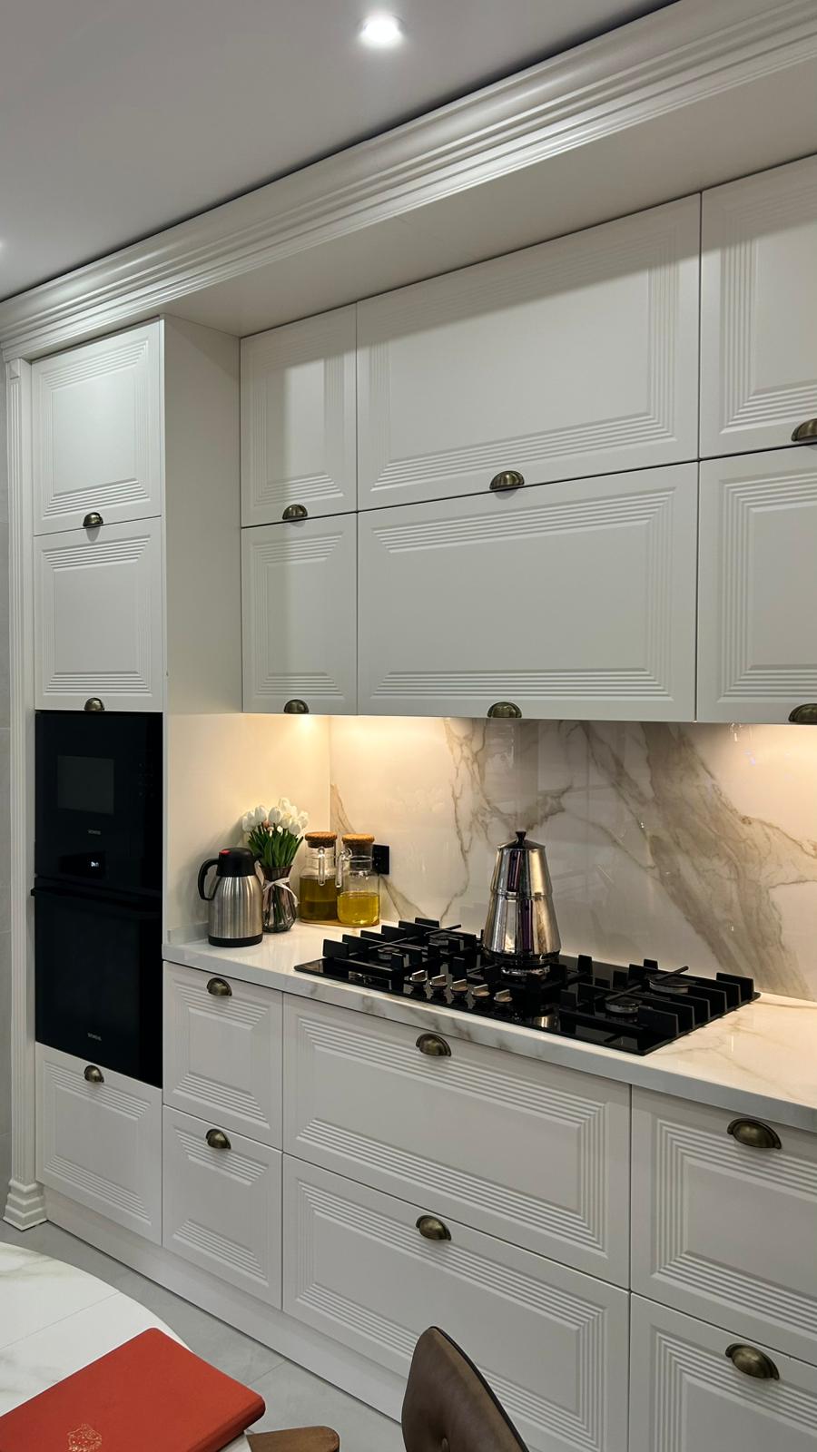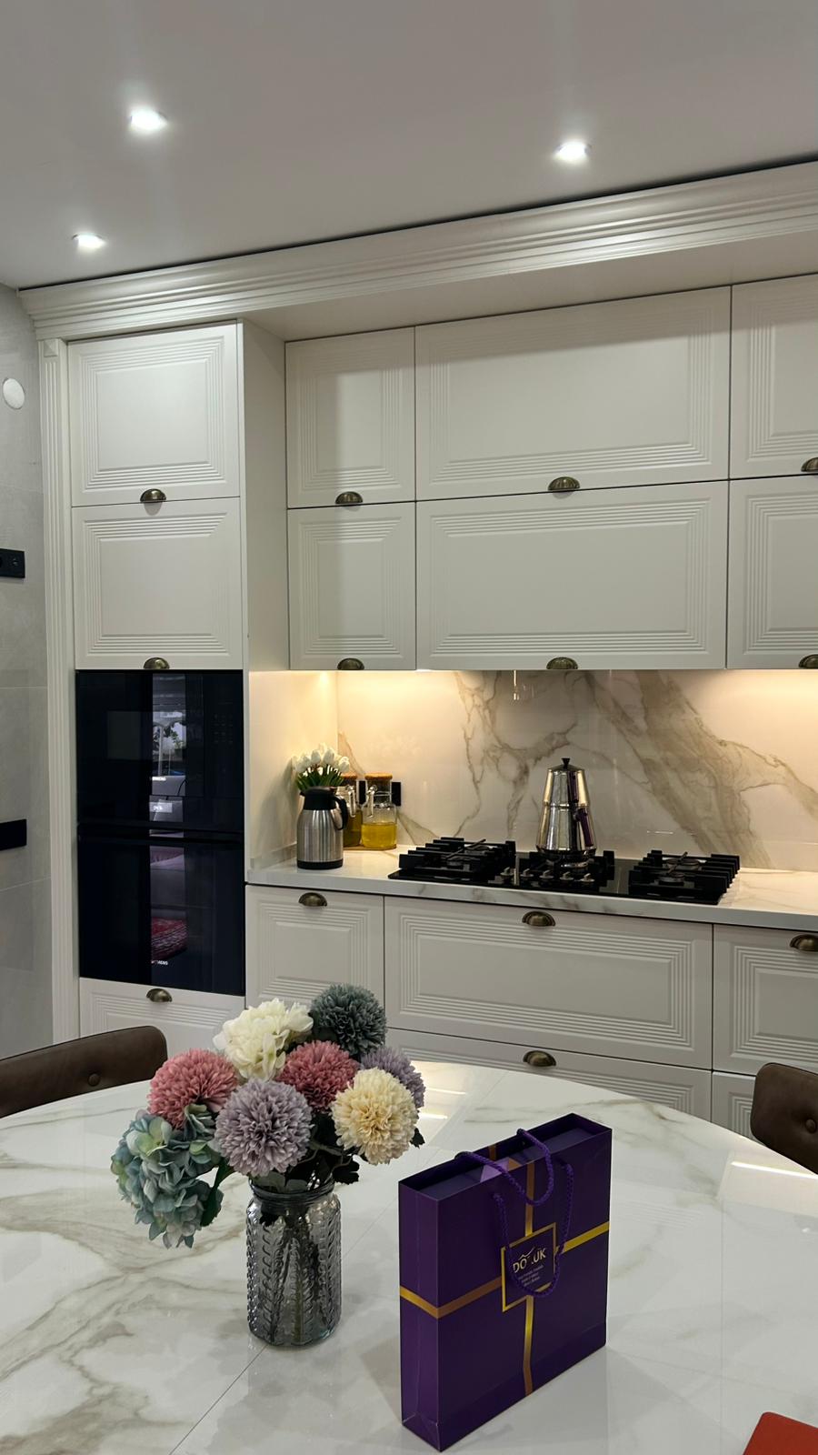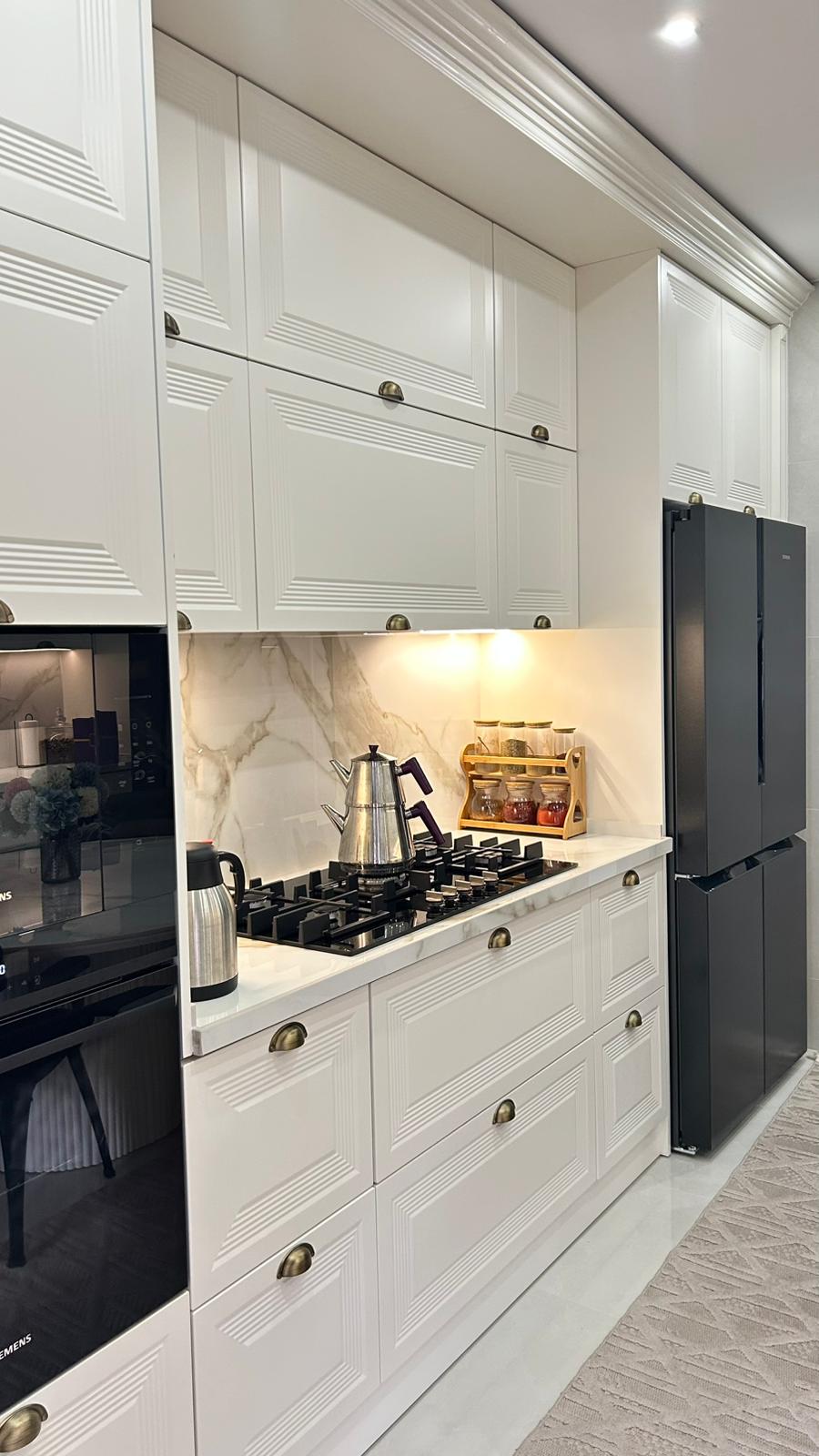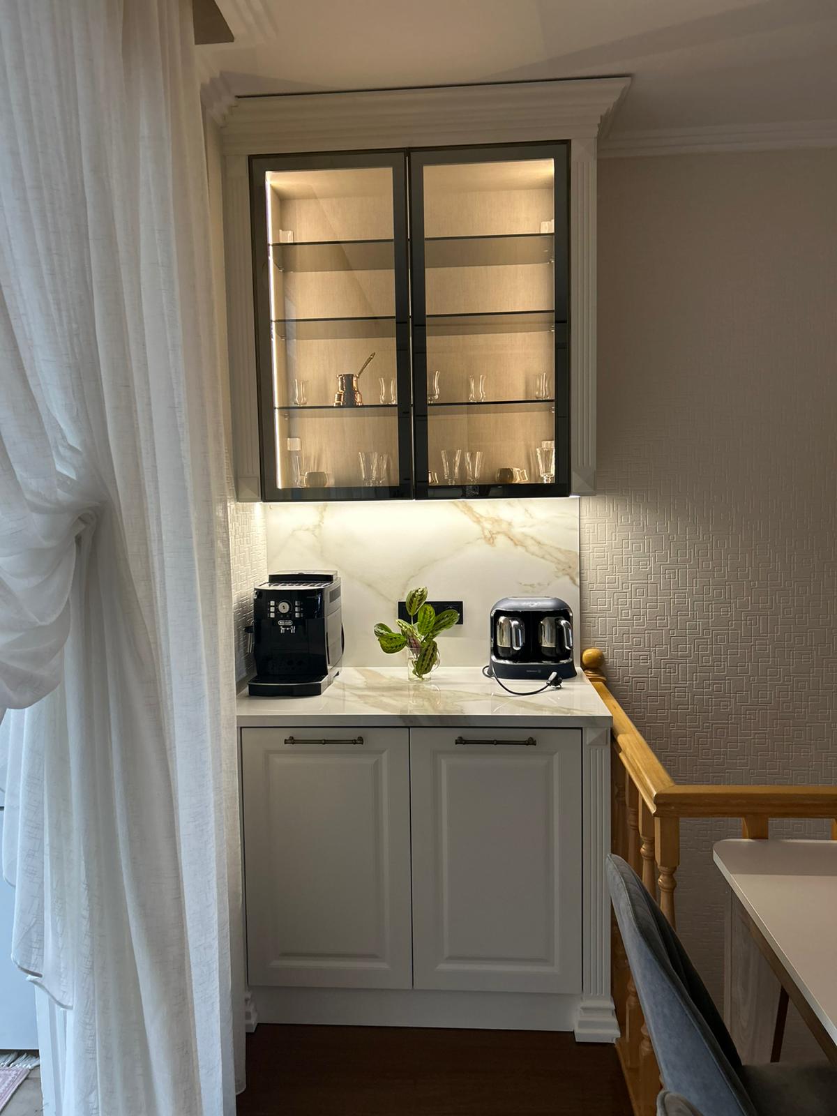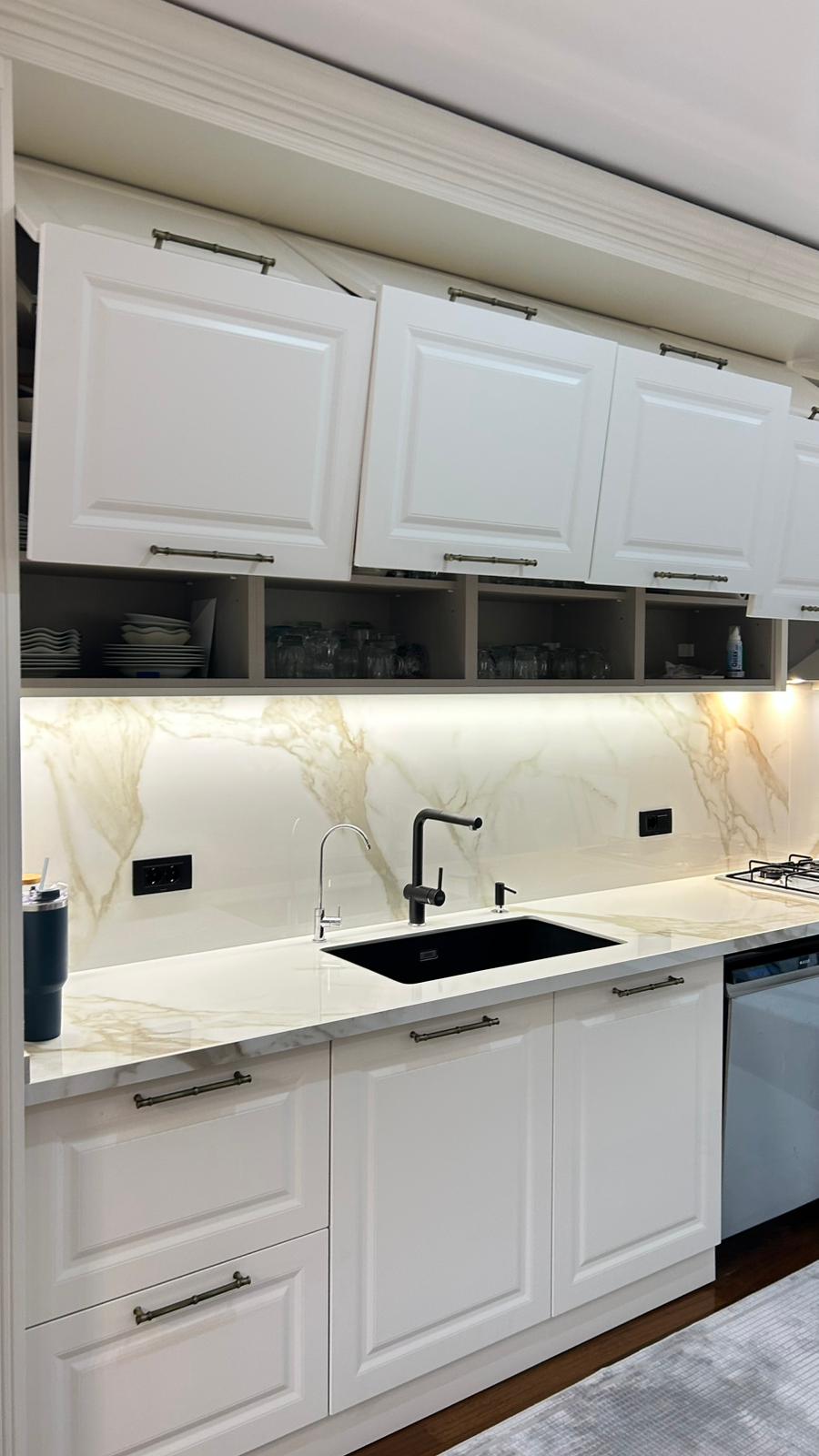 Bu projede 2 adet mutfak ve 1 adet TV ünitesi tasarım, üretim ve uygulaması tarafımızdan anahtar teslim olarak gerçekleştirilmiştir. Klasik ve modern çizgilerin harmanlandığı özel üretim mobilyalar, fonksiyonel çözümler ve dekoratif aydınlatma detaylarıyla mekâna estetik ve kullanışlı bir bütünlük kazandırılmıştır.