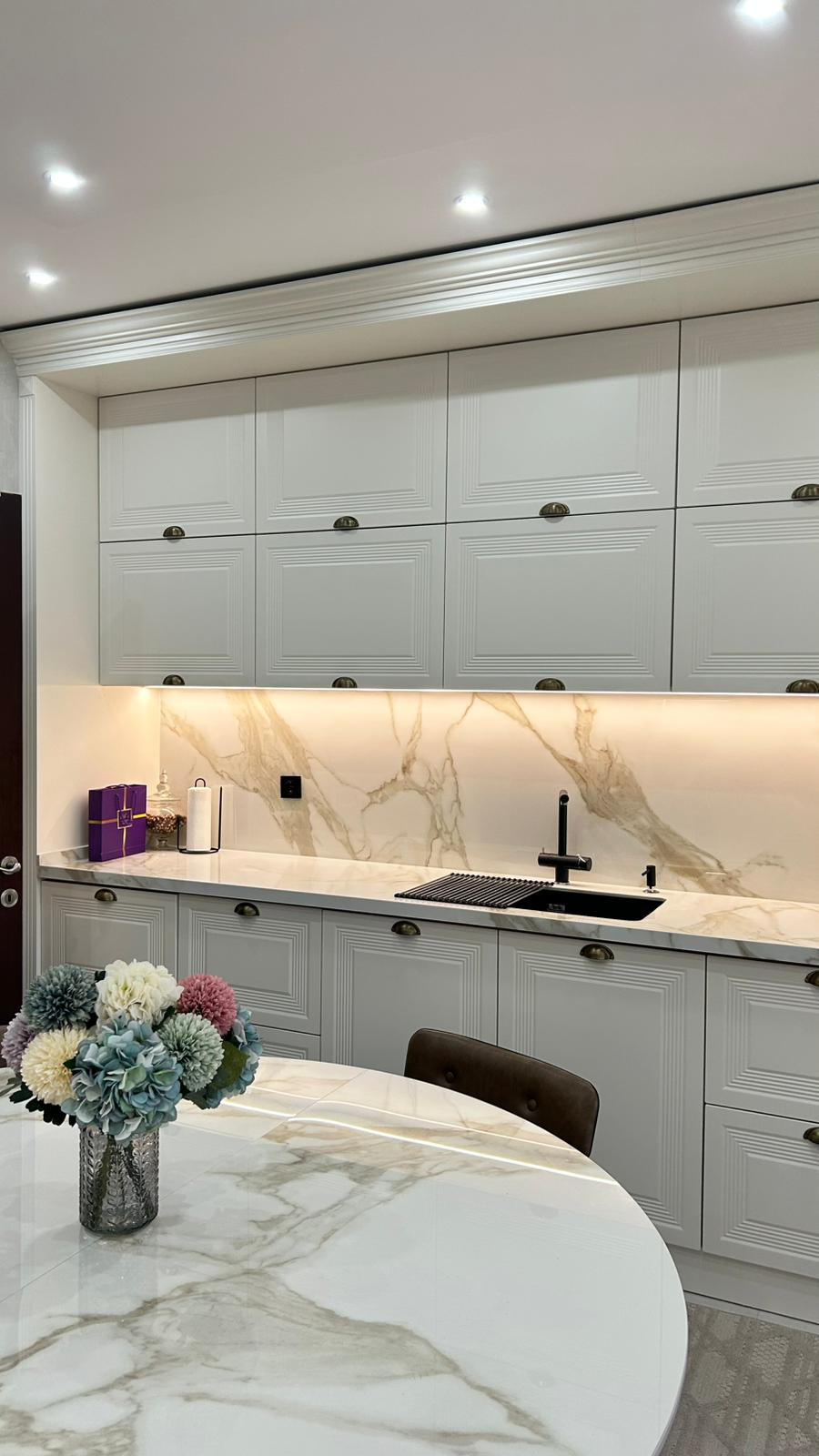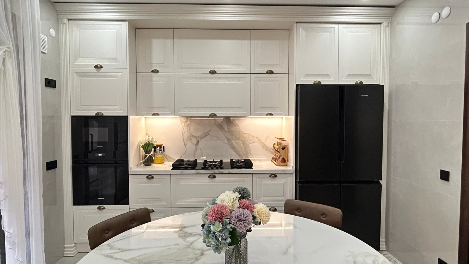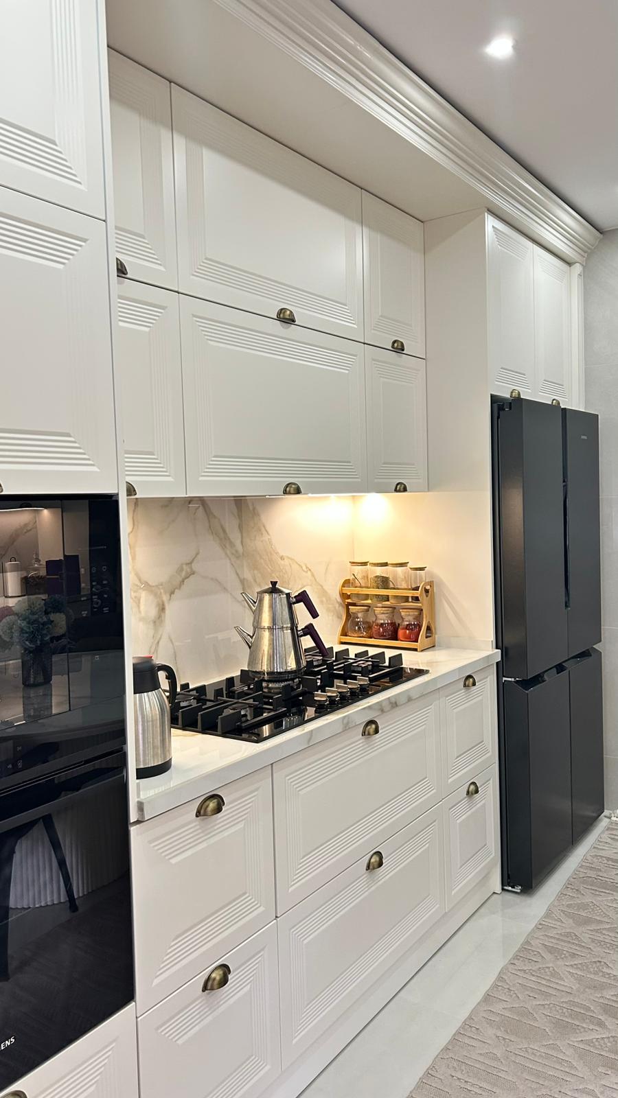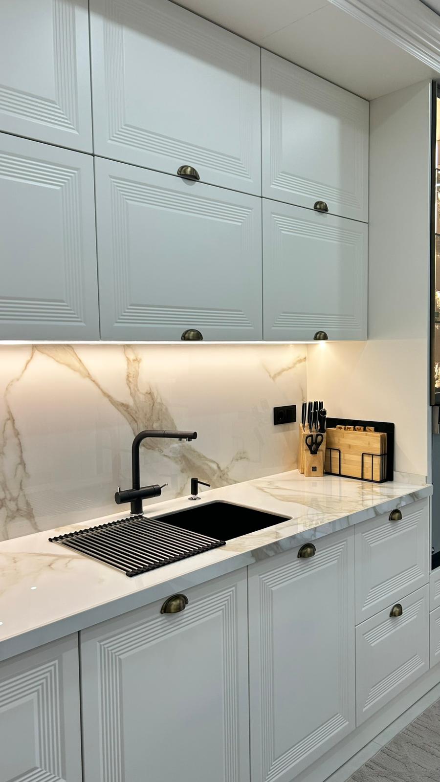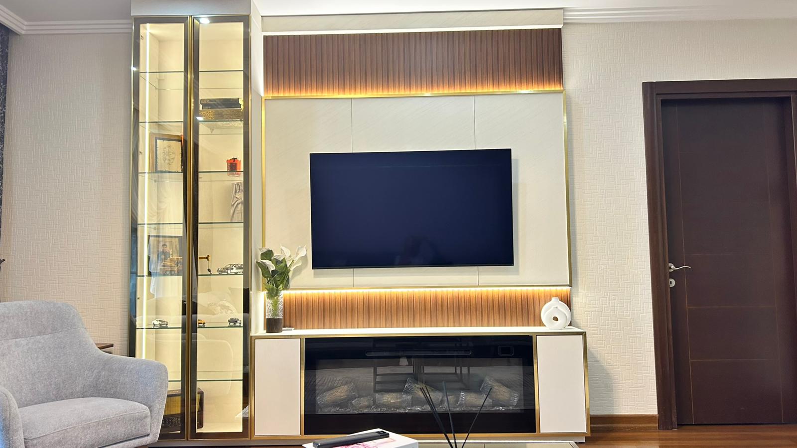 Bu projede 2 adet mutfak ve 1 adet TV ünitesi tasarım, üretim ve uygulaması tarafımızdan anahtar teslim olarak gerçekleştirilmiştir. Klasik ve modern çizgilerin harmanlandığı özel üretim mobilyalar, fonksiyonel çözümler ve dekoratif aydınlatma detaylarıyla mekâna estetik ve kullanışlı bir bütünlük kazandırılmıştır.