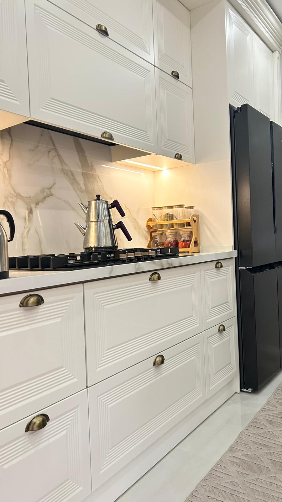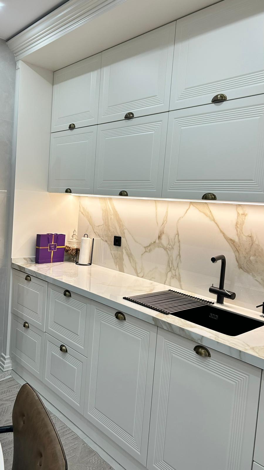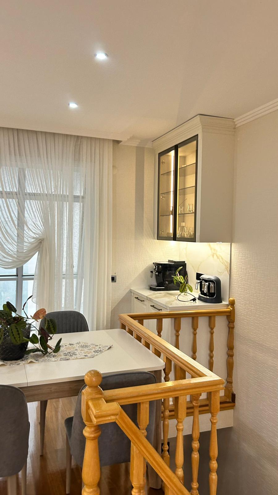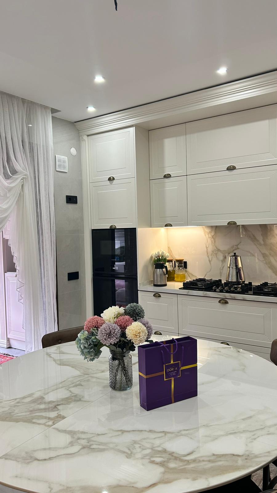 Bu projede 2 adet mutfak ve 1 adet TV ünitesi tasarım, üretim ve uygulaması tarafımızdan anahtar teslim olarak gerçekleştirilmiştir. Klasik ve modern çizgilerin harmanlandığı özel üretim mobilyalar, fonksiyonel çözümler ve dekoratif aydınlatma detaylarıyla mekâna estetik ve kullanışlı bir bütünlük kazandırılmıştır.